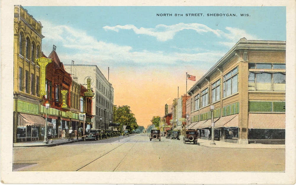 Looking North on 8th Street, Sheboygan. Foeste Hotel and Fountain Park one block up on the left.