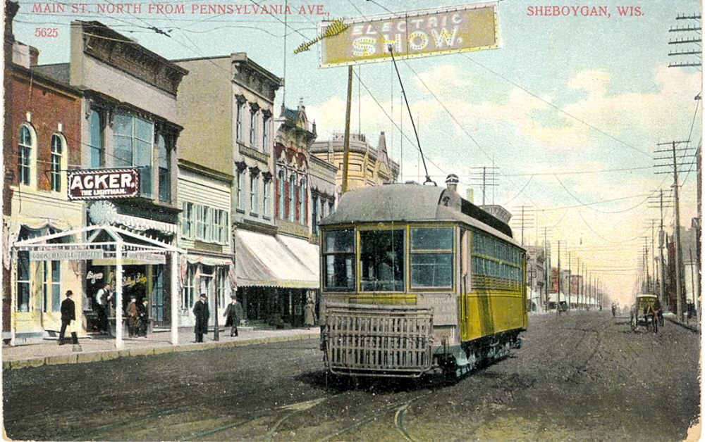 Looking north from 8th and Pennsylvania, Sheboygan. The streetcar reigns supreme.